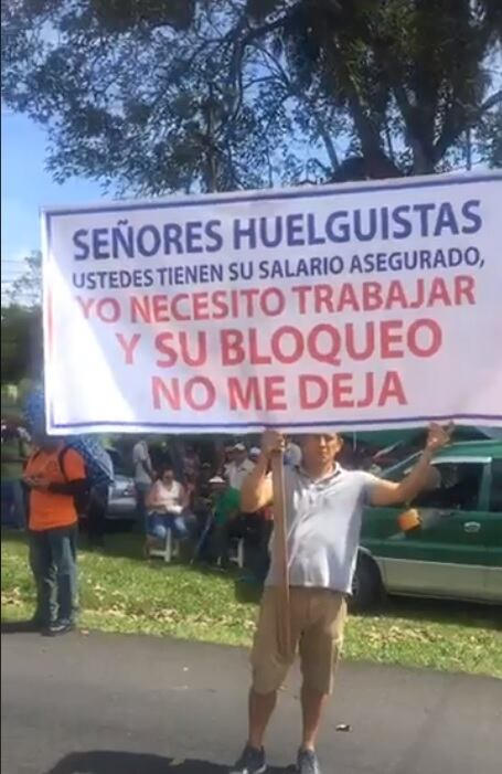 El breteador hizo un rótulo que dice: ‘Señores huelguistas, ustedes tienen un salario asegurado, yo necesito trabajar y su bloqueo no me deja”.