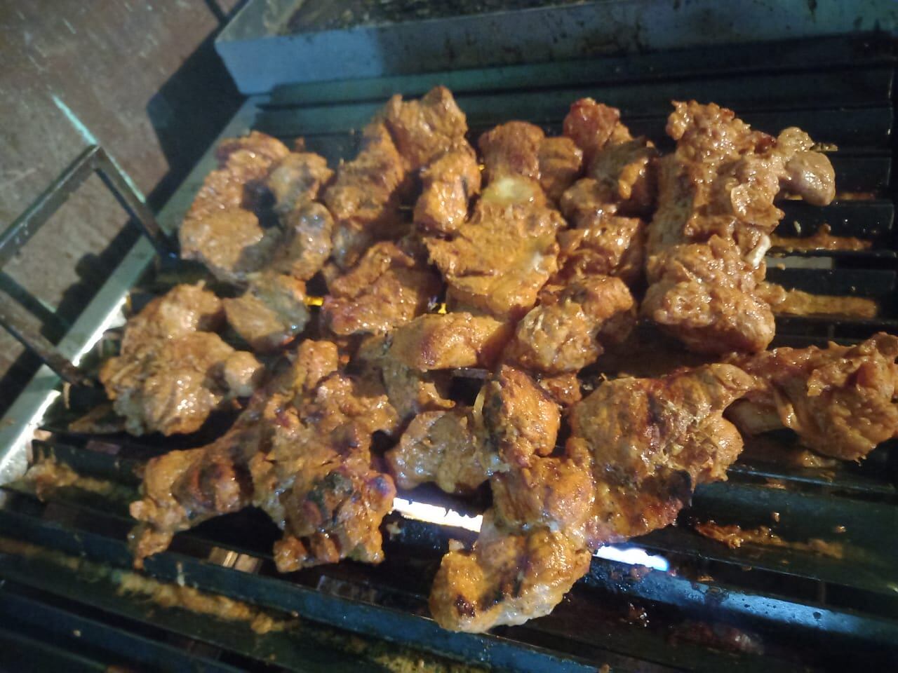 La carne asada es la carne a la parrilla como se le conoce acá, de res, cerdo o pollo, pero no en pinchos como estamos acostumbrados, sino servidos en un plato con plátano verde sancochado y ensalada.