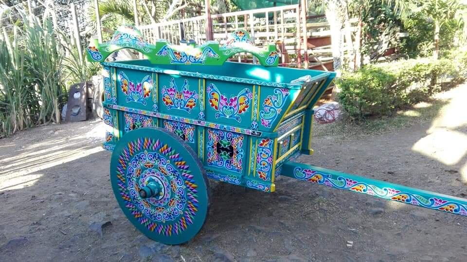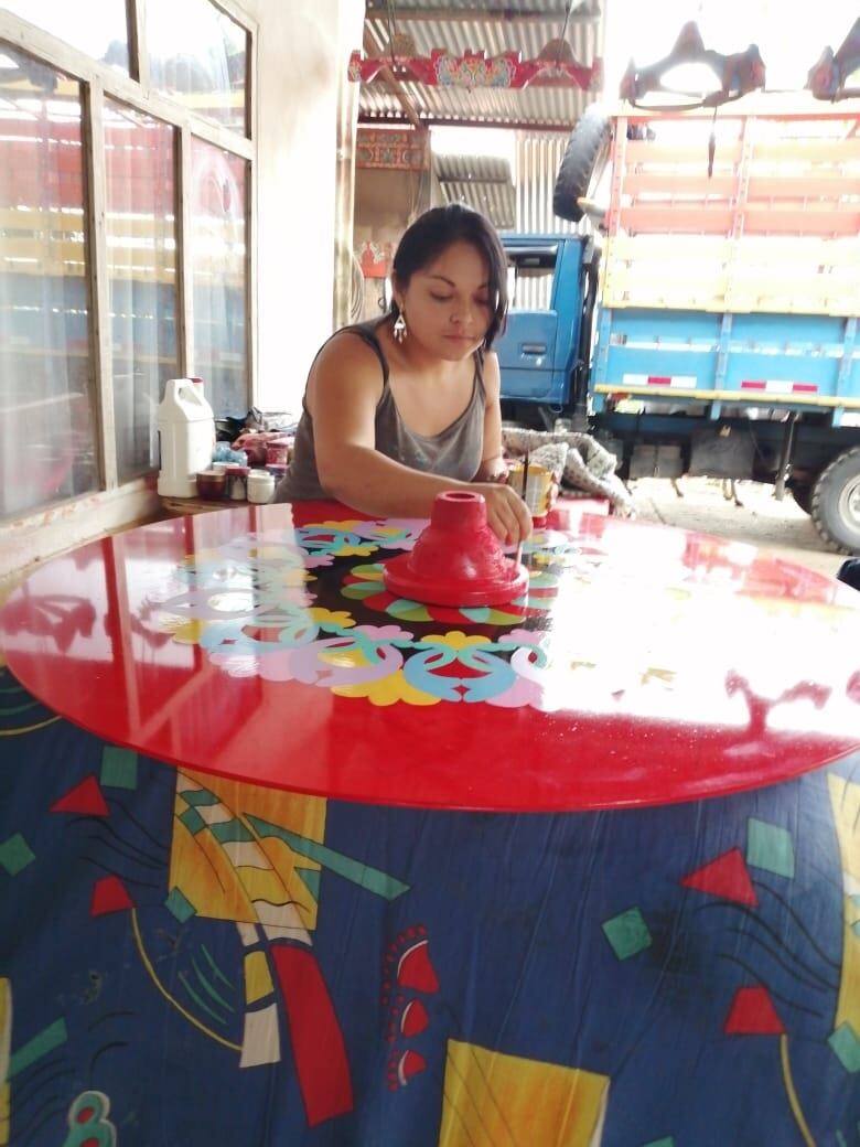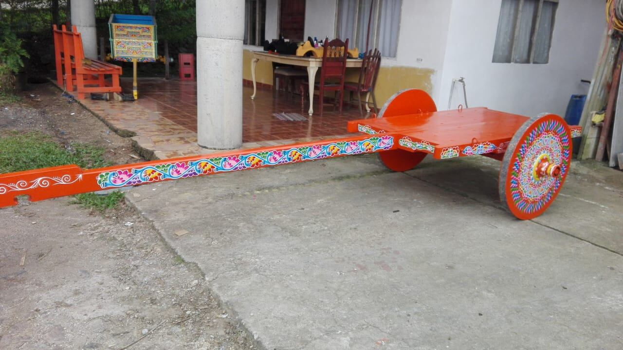 Aunque ella había visto a sus tíos pintar carretas cuando desde que era niña, nunca se animó a hacerlo, pero cuando se casó le dio vueltas al “disco duro” para ayudarle a su esposo en el tallercito donde fabrican, restauran y pintan carretas. Hasta las ruedas, que tienen su ciencia, hacen.