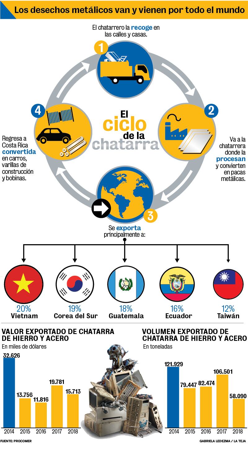 Y es que el trabajo que hace don Luis le da la vuelta al mundo, sí, así como lo lee. La lata que recogió en El Coyol será procesada y abordará un barco para partir rumbo a Asia. Allá se procesará nuevamente y regresará a América para que la volvamos a usar. Este es el ciclo de la chatarra, un negocio que mueve millones. Se lo detallamos en la infografía que acompaña esta nota.