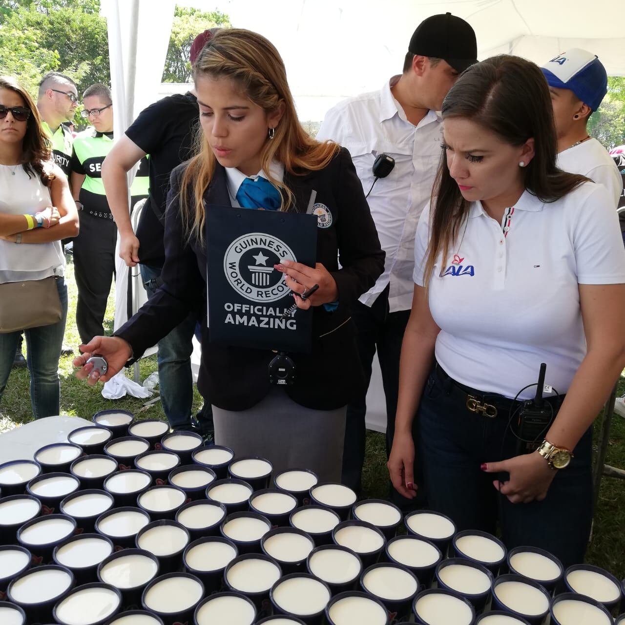 A las 10:25 de la mañana, ni un segundo más, la representante de “Guinness World Records”, Natalia Ramírez, alzó su mano y ordenó detener el servicio de vasitos de leche, incluso hasta la música se silenció, hubo como 15 segundos sepulcrales, todos volvieron sus ojos a la muchacha de saco azul, la de Guinness.