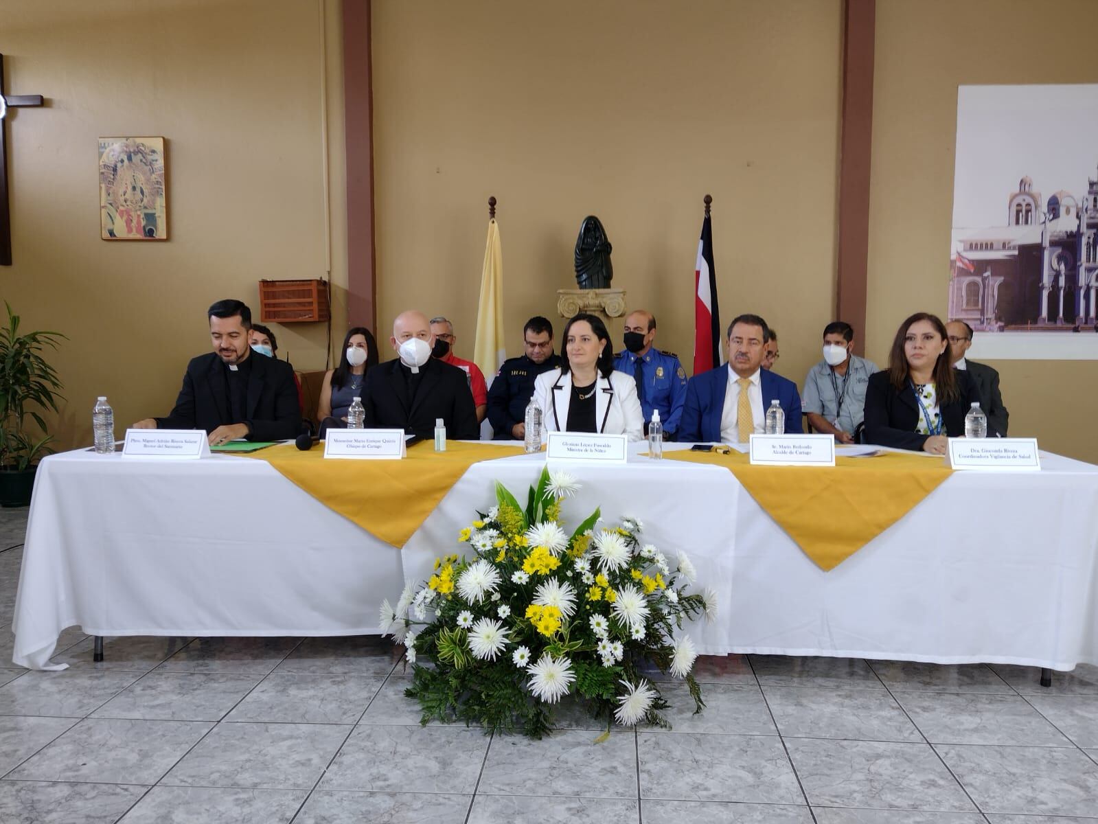 En la conferencia también están presentes el padre Miguel Adrián Rivera, rector del Santuario; Mario Enrique Quirós, obispo de Cartago; Gloriana López, ministra de la Niñez; el alcalde Redondo y la doctora Gioconda Rivera, coordinadora de vigilancia d salud.