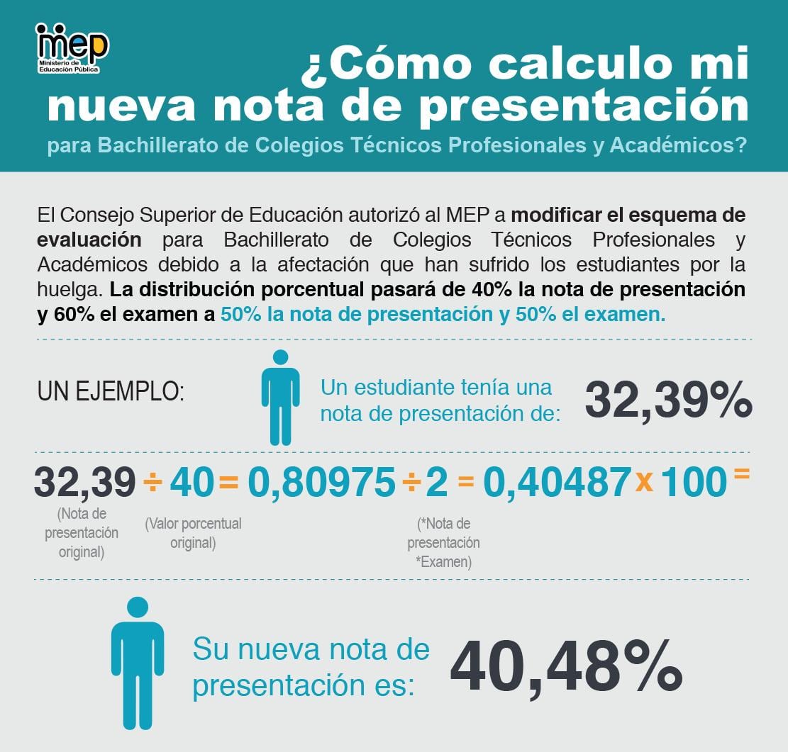 Sin mucho mate, aquí les dejamos el detalle de cómo debe hacer para saber cuál será su nueva nota de presentación, tal y como lo explica el MEP en una ilustración.