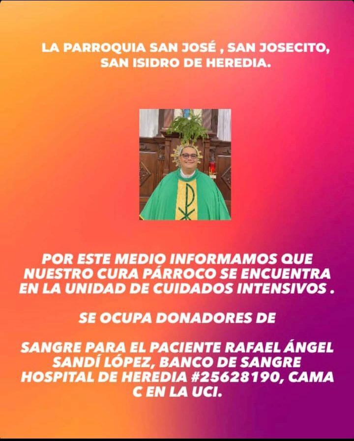 Debido a los tratamientos que deben hacerle, el sacerdote necesita recibir transfusiones de sangre. La parroquia de San Josecito de San Isidro de Heredia subió este miércoles una imagen al Facebook en la que piden a las personas que se acerquen al hospital de Heredia a donar sangre.
