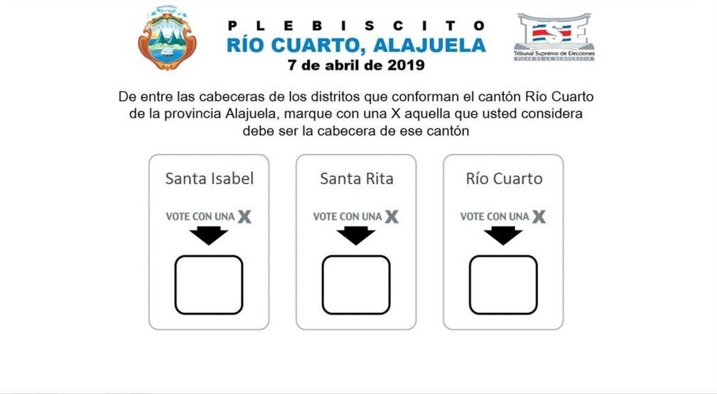 El texto que encontrarán los electores será el siguiente: “De entre las cabeceras de los distritos que conforman el cantón Río Cuarto de la provincia Alajuela marque con una X aquella que usted considera debe ser la cabecera de ese cantón”.