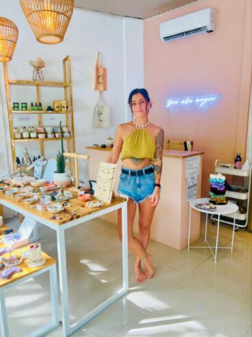 De regreso a Santa Teresa comenzó a trabajar en restaurantes y hoteles, hasta que hace dos años y medio abrió su local de cosmética natural. Eso le permitió encontrar paz, tranquilidad y un lugar para vivir libre y al lado de la playa.