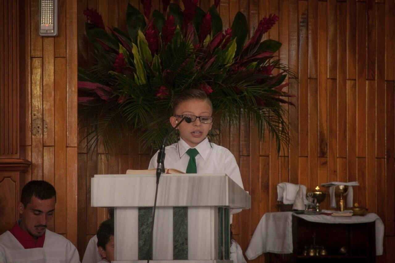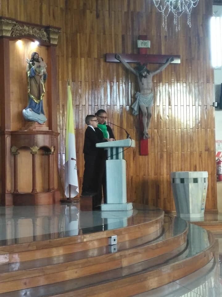 Él aprendió a leer desde el prekinder según nos dijo su mamita, por eso, pese a su corta edad supo ganarse un espacio fijo en el grupo de lectores desde el 28 de mayo del 2018 y participa cada domingo en la misa de las 11 a. m.