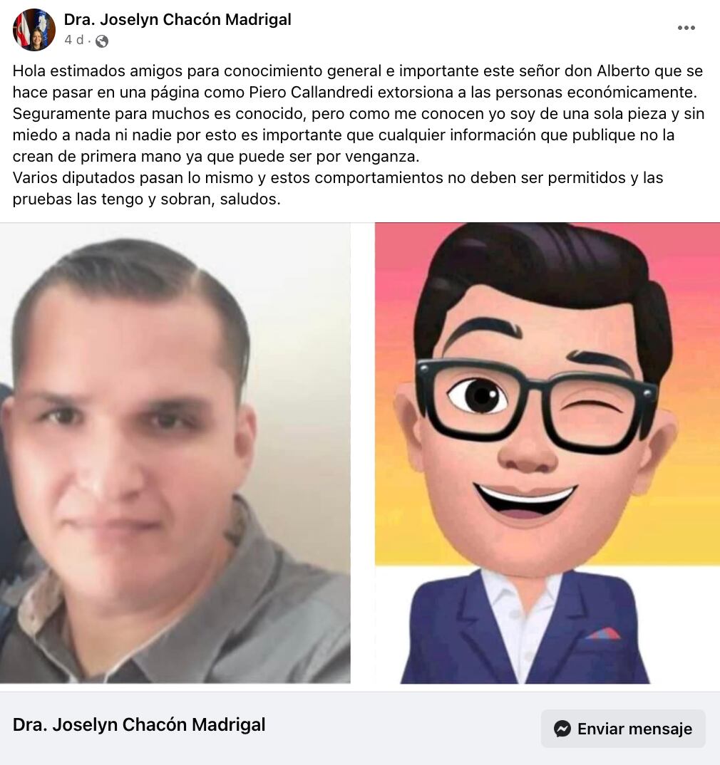 Alberto Jesús Vargas Zúñiga es quien inventó el personaje que solo existe en redes sociales, “Piero Calandrelli”. Pues bien, Vargas Zúñiga le aseguró a La Nación que la ministra Chacón le pagó durante meses para que produjera y publicara ataques contra periodistas en redes sociales como Facebook y TikTok. Casi siempre eran ataques para los periodistas que criticaban de alguna forma a la ministra.