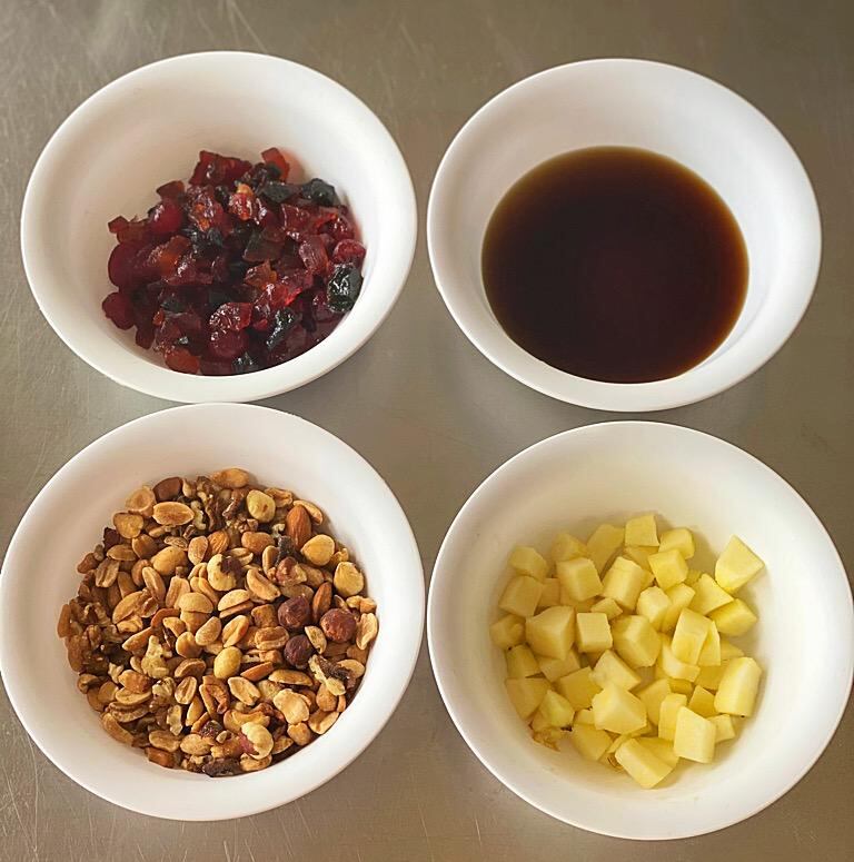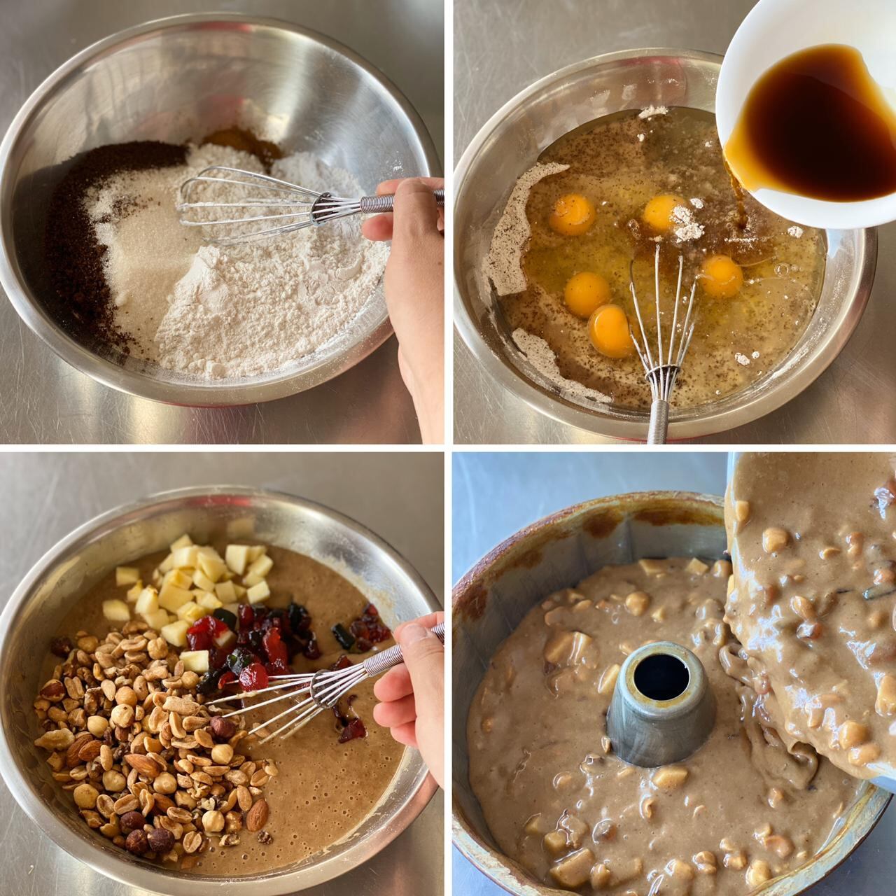 Finalmente incorpore las semillas, frutas y manzana, coloque en molde engrasado mediano, y lleve al horno por unos 50 minutos a 350 grados F.