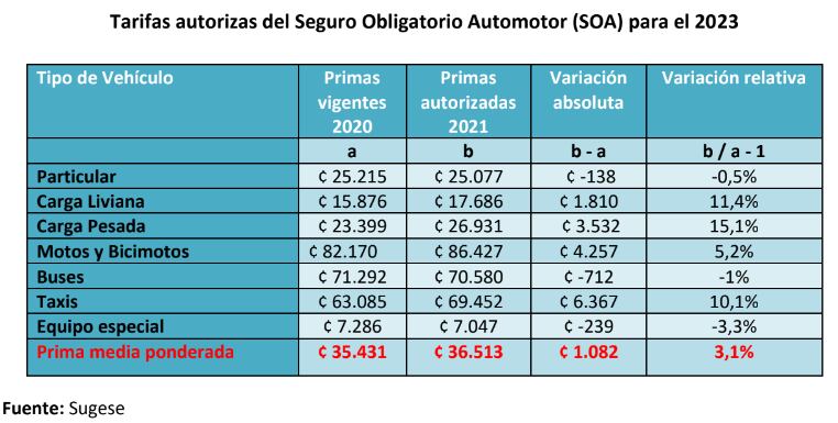 La Superintendencia General de Seguros (Sugese), aprobó este viernes las tarifas del Seguro Obligatorio de Automóviles (SOA) que el Instituto Nacional de Seguros (INS) fijó para el período 2023.