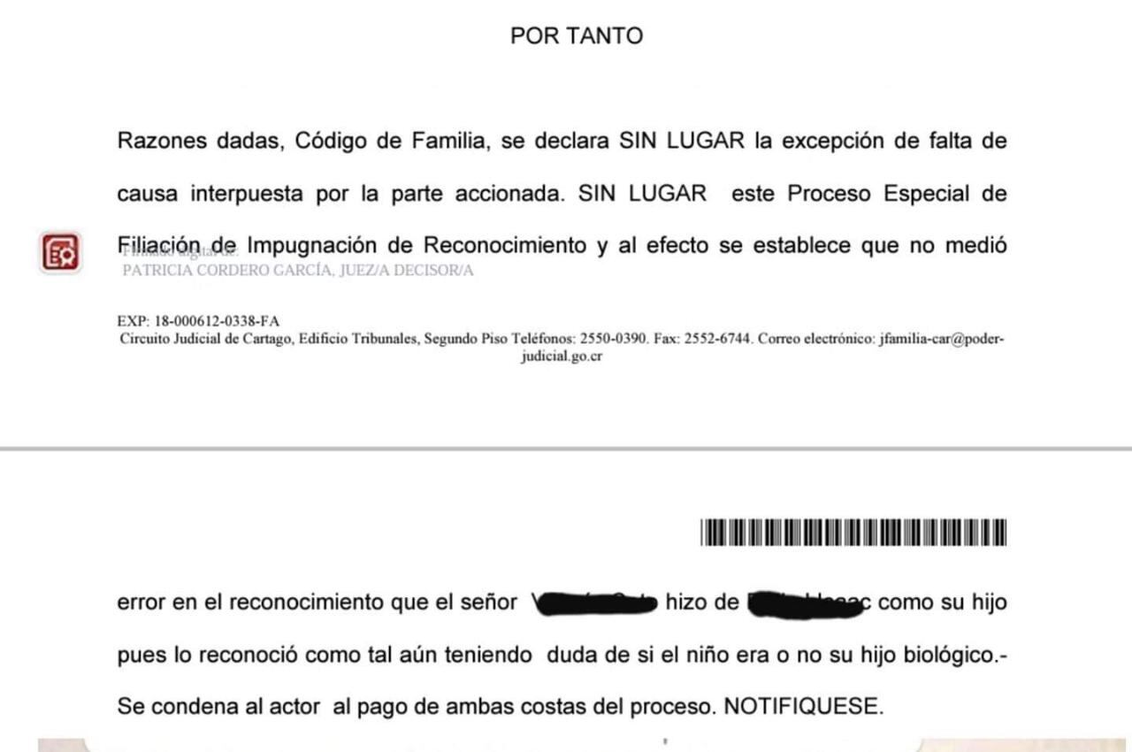 A partir de ahí comenzó su lucha en los Tribunales de Cartago para que le quitaran la pensión ante esta revelación, pero pese a que la madre del niño se contradijo diciendo, esta vez, que ella siempre le dijo que el niño no era de él, le creyeron a ella y no a él, pese a que los testigos que ella aportó eran su madre y una amiga.