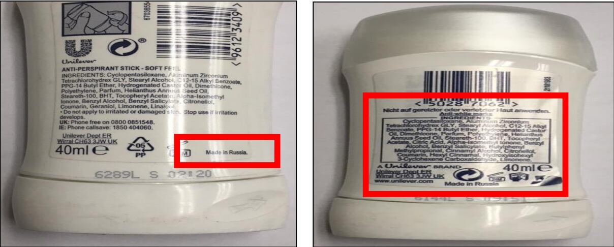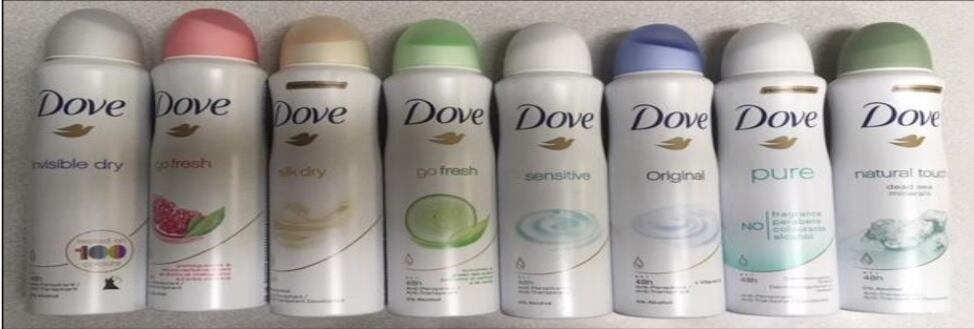 En el caso particular de los desodorantes en barra marca Dove, el original es de color blanco y lleva una impresión en forma de paloma al inicio, que es característica de la marca, mientras que los paqueteados son amarillos y sin ese dibujo.