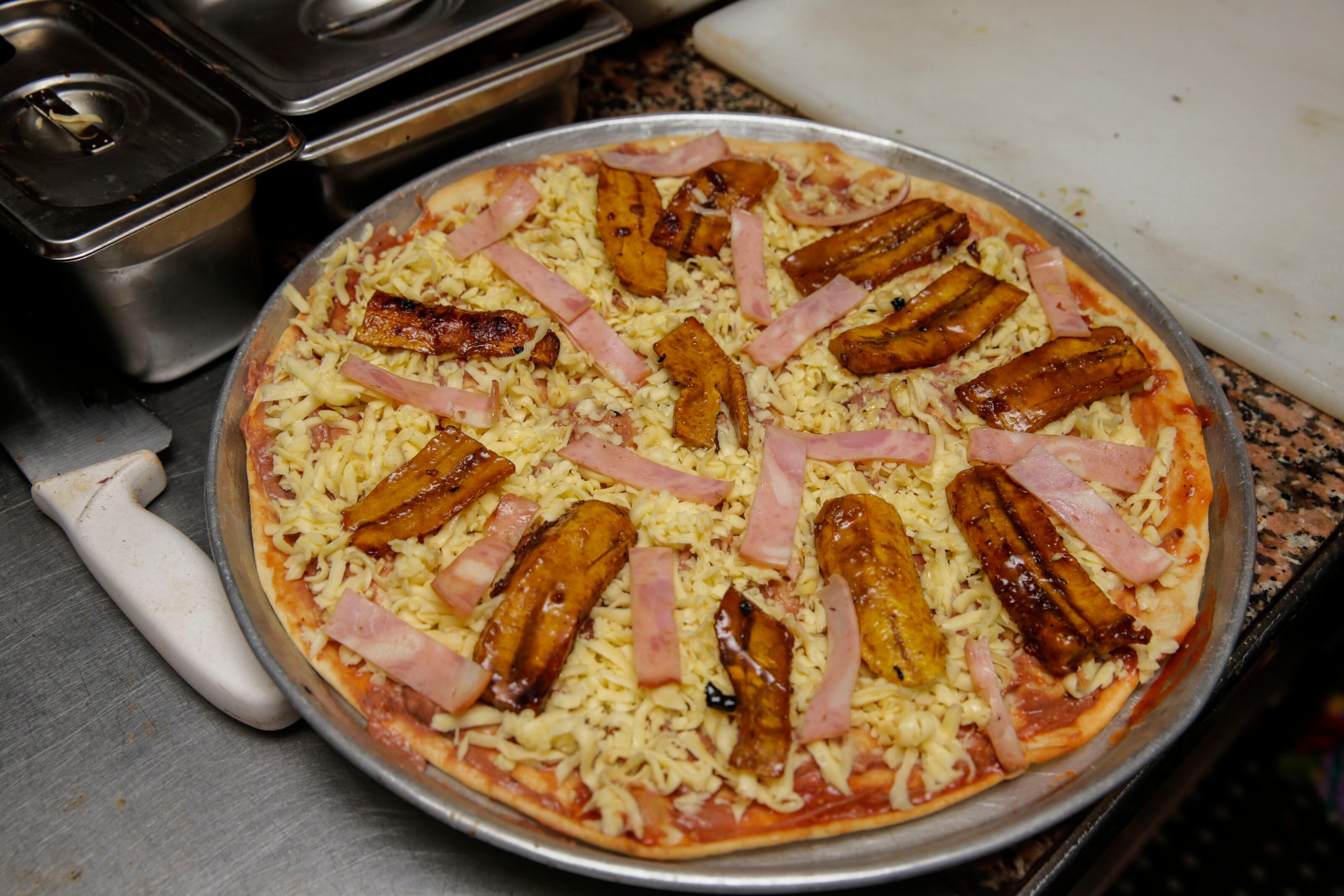 La búsqueda llevó de un producto a otro y la respuesta perfecta fue el plátano, un producto fundamental de la cocina caribeña y al que encontramos convertido en patacones o dentro del dulce plantintá. El chef Jairo Campos se la jugó como los grandes y usó la pasta regular de pizza y además de platanito le puso frijoles, queso y tocineta.