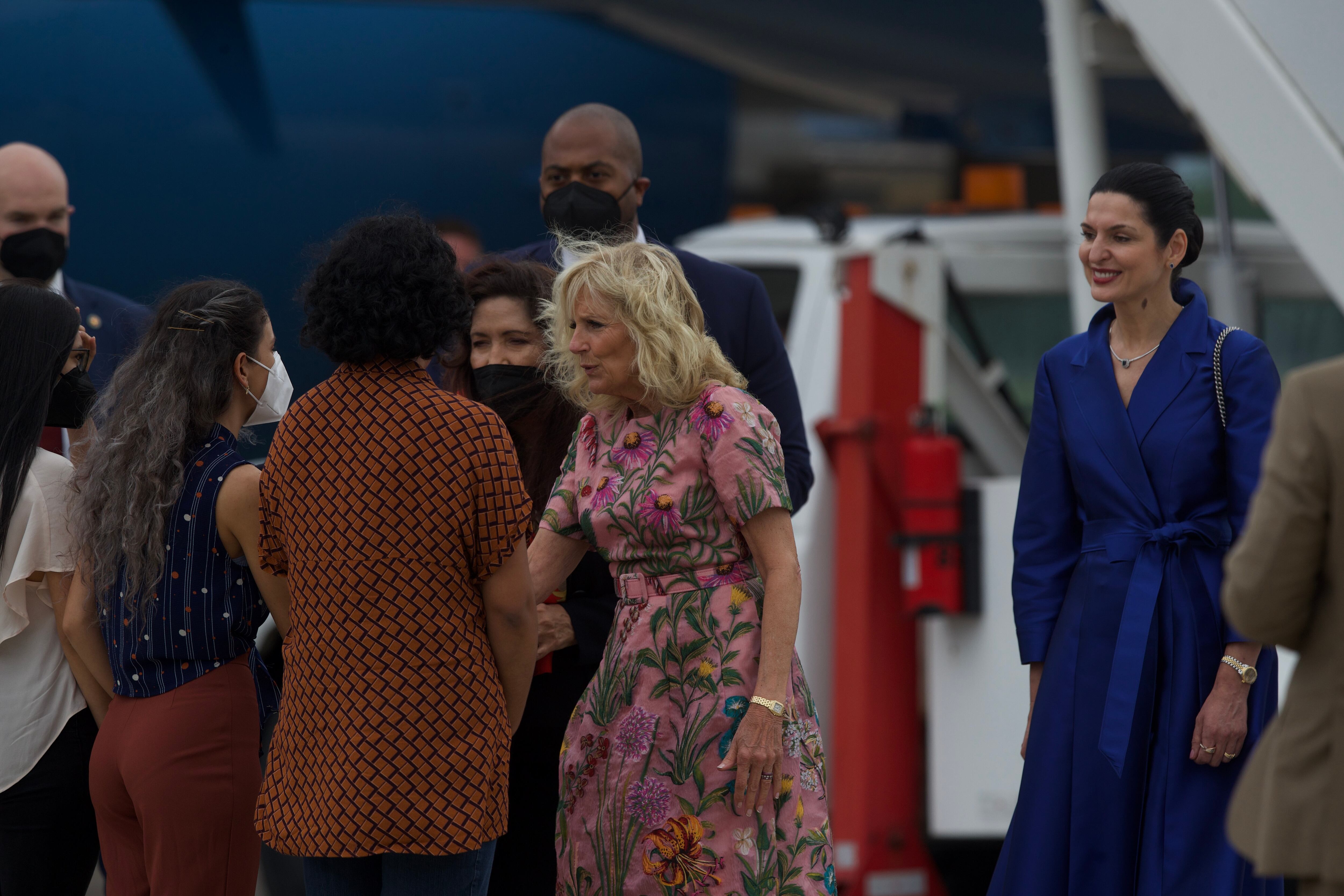 Este sábado por la tarde, la esposa del presidente de la República Rodrigo Chaves recibió a la primera dama de Estados Unidos, Jill Biden, en el aeropuerto Juan Santamaría.