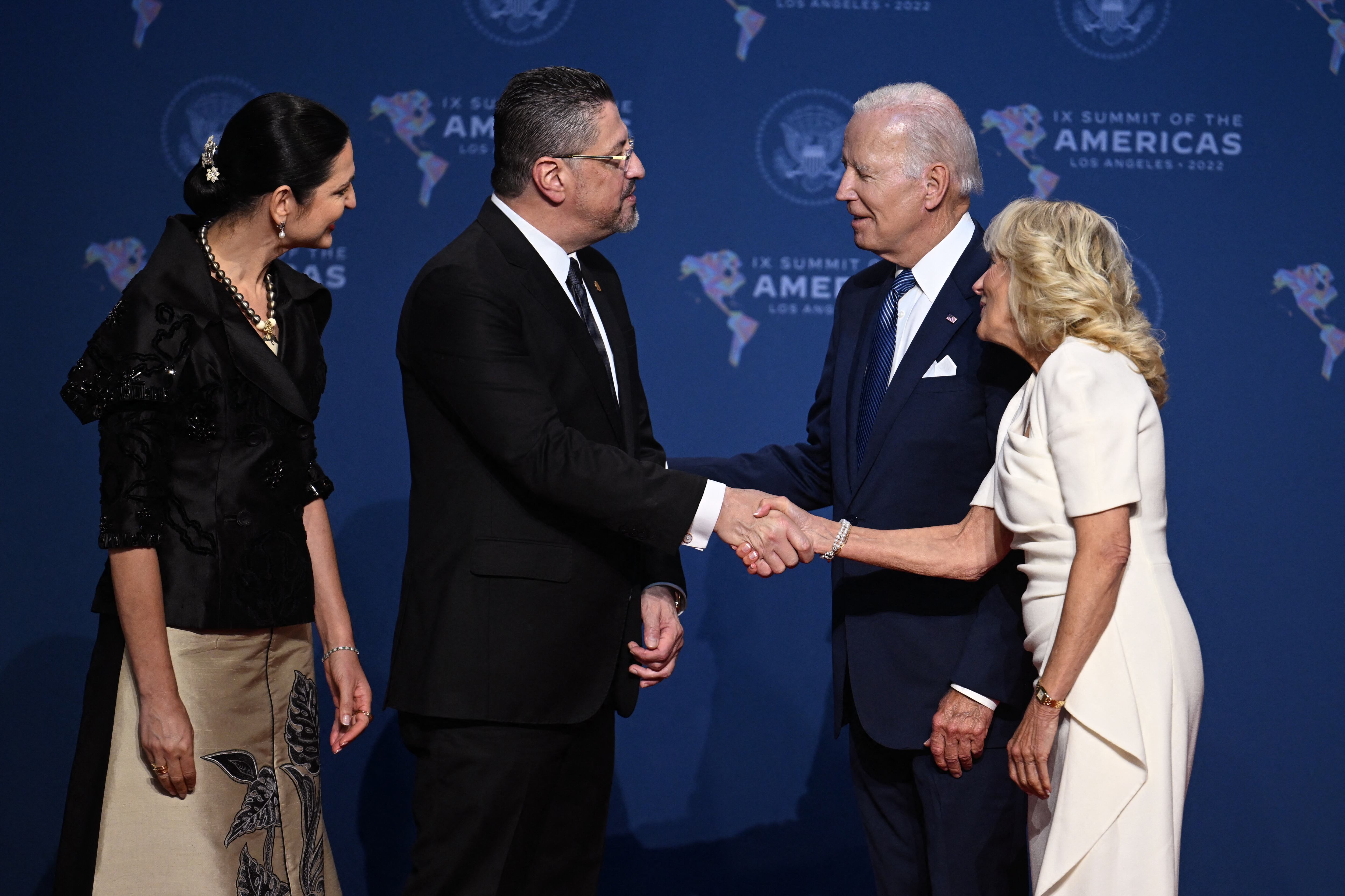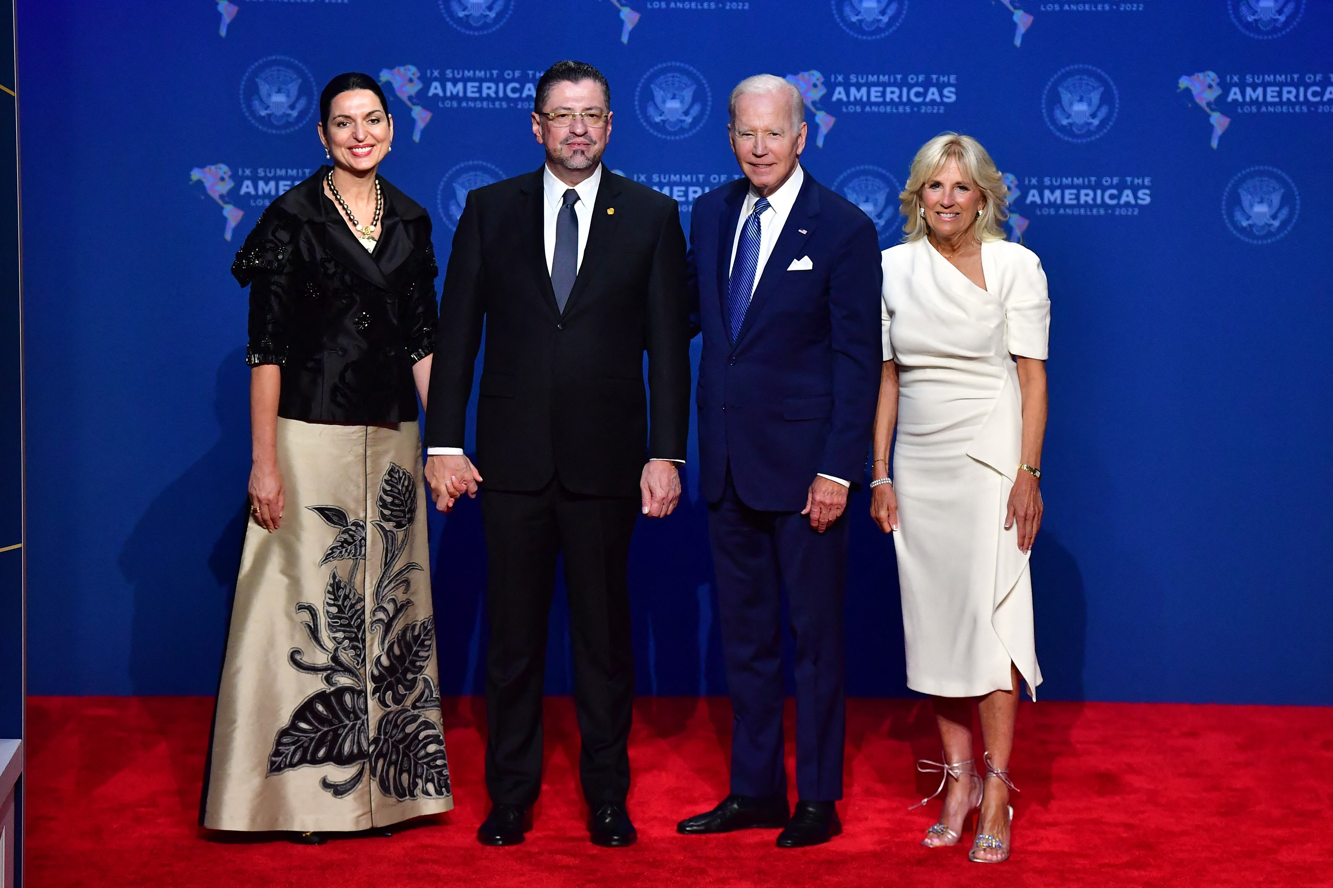 En las imágenes la vemos al lado del presidente de la República, Rodrígo Chaves, cuando caminan por la alfombra roja antes del inicio de la inauguración de la cumbre en el Centro de Convenciones de Los Angeles.