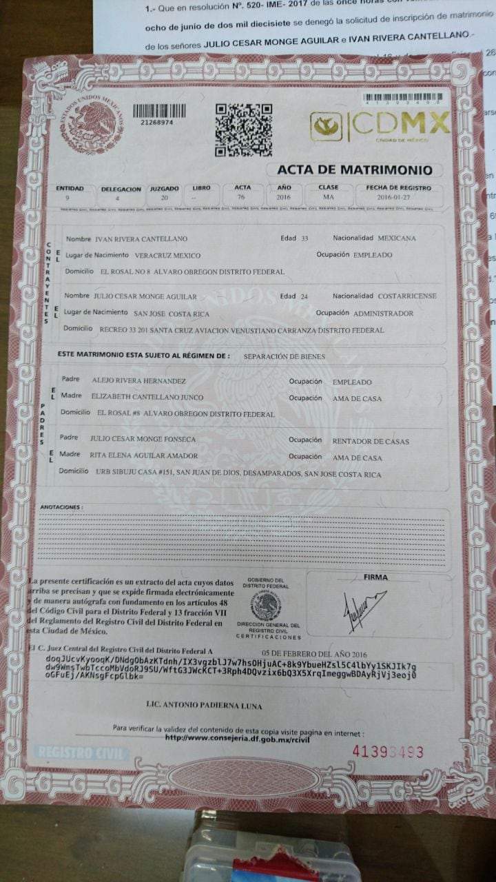 Su primer acercamiento para poner los papeles en regla en Costa Rica fue con la embajada tica en México.