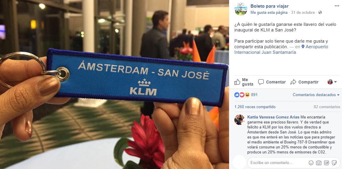 La página Boleto para viajar fue la causante de tremenda locura, luego de postear una foto que decía “¿A quién le gustaría ganarse este llavero del vuelo inaugural de KLM a San José? Para participar solo tiene que darle me gusta y compartir esta publicación”.