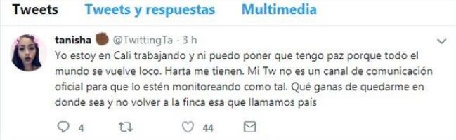 "Yo estoy en Cali (Colombia) trabajando, y ni puedo poner que tengo paz porque todo el mundo se vuelve loco. Harta me tienen. Mi Tw (cuenta de Twitter) no es un canal de comunicación oficial para que lo estén monitoreando. Qué ganas de quedarme en donde sea y no volver a la finca esa que llamamos país".