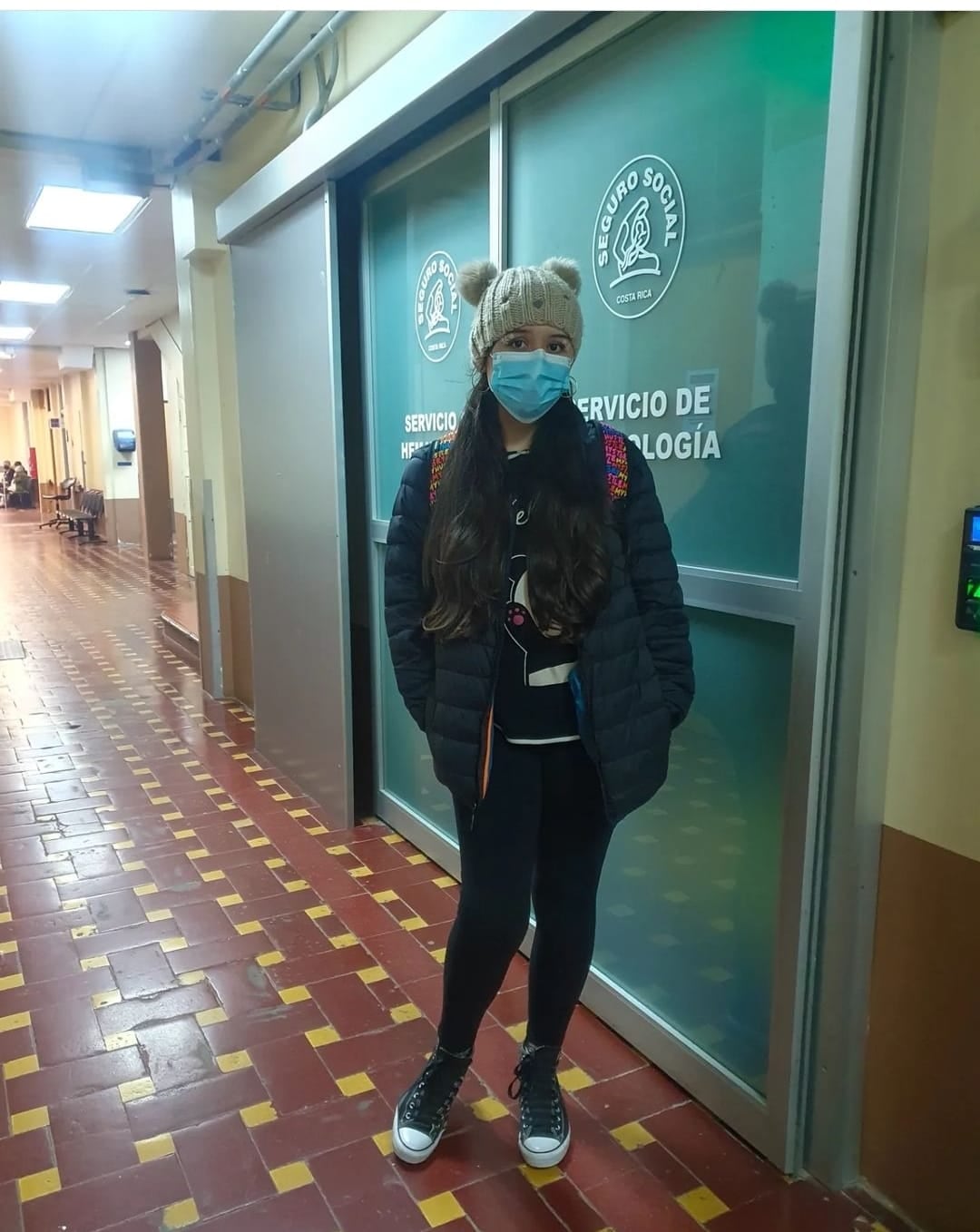 “El tratamiento me lo están poniendo en el hospital Calderón Guardia y las enfermeras son un amor, lo tratan a uno superbién, me dan comidita y todo. Con la primera sesión me fue bastante mal, me dieron unos dolores de cabeza terribles, vómitos, sentía como una quiebrahuesos terrible, la comida no me sabía, tenía que pasar mucho tiempo en la cama de lo mal que me sentía, por momentos quería dormirme y ya no abrir los ojos más, de verdad, pero mi mamá, que fue la que estuvo ahí en todo momento y Dios me dan la fuerza para seguir luchando. También el apoyo de mi tío Geovanny Monge ha sido incondicional.