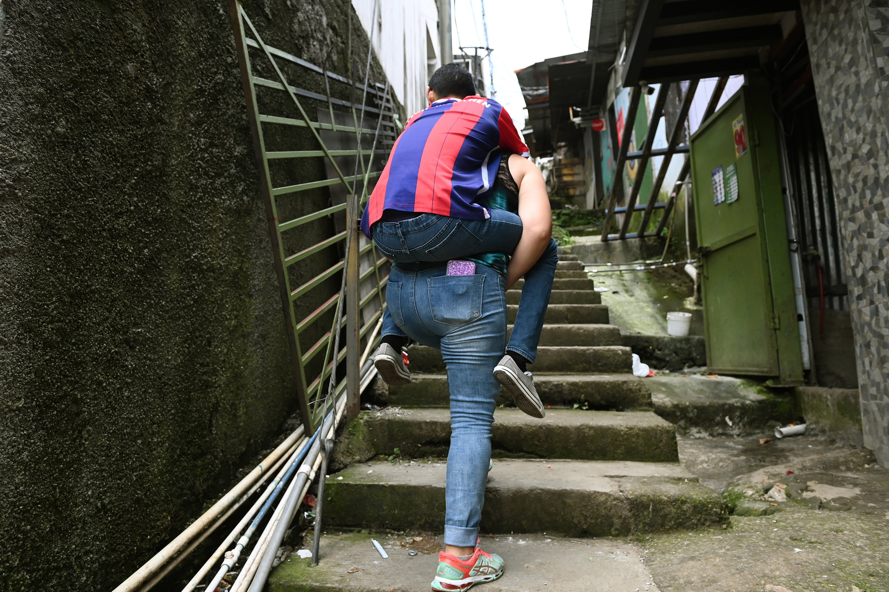 La única manera en la que Ruth puede pasar las gradas con su muchacho es cargándolo a caballito sobre su espalda.