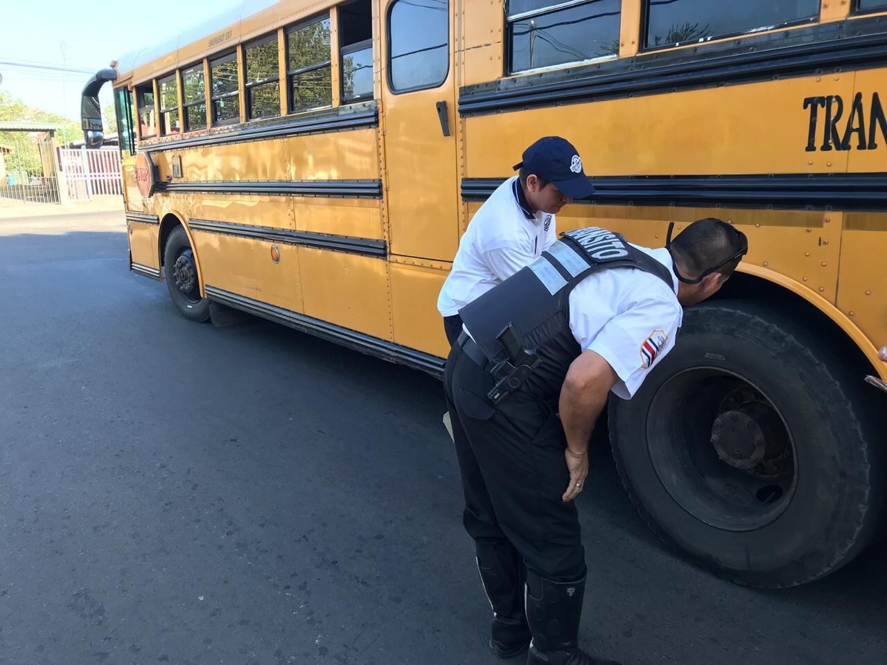 El Grupo de Operaciones Especiales (GOE), región Pacífico, de la Policía de Tránsito detuvo en Orotina tres buses de transporte de estudiantes con llantas tan gastadas que parecía se iban a estallar, lo peor, los tres buses llevaban estudiantes al momento de la revisión en carretera que les realizaron.