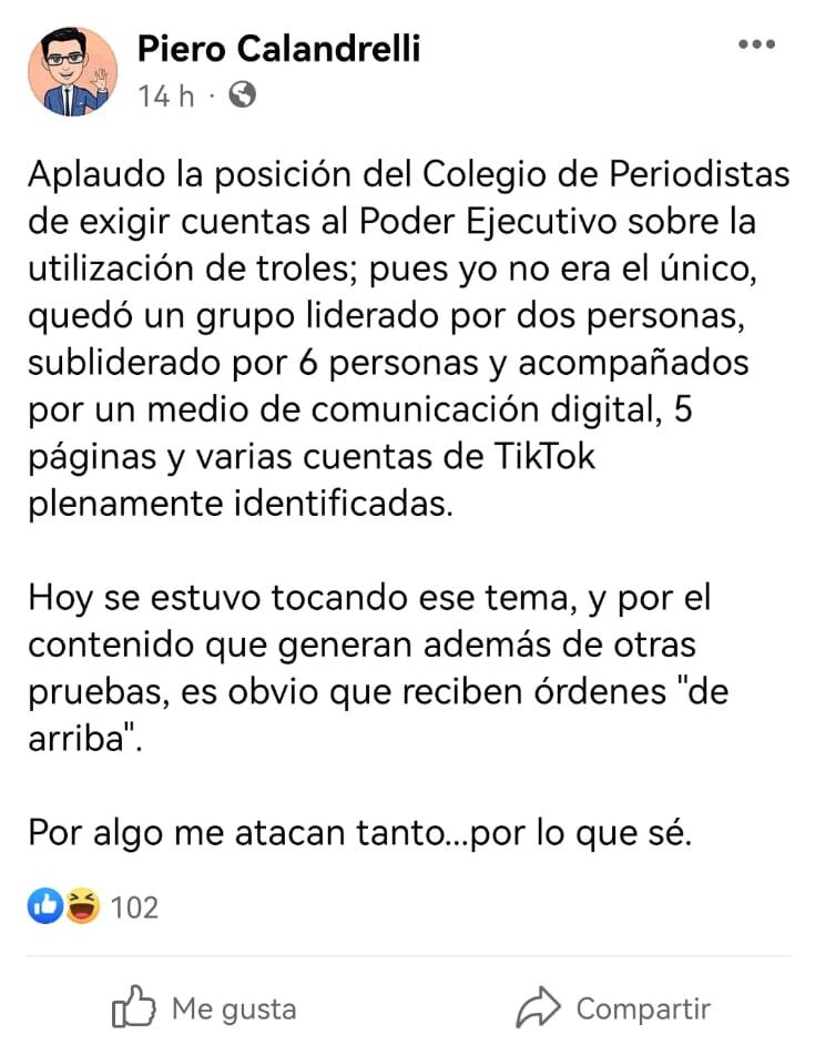 “Aplaudo la posición del Colegio de Periodistas de exigir cuentas al Poder Ejecutivo sobre la utilización de troles; pues yo no era el único, quedó un grupo liderado por dos personas, subliderado por seis personas y acompañados por un medio de comunicación digital, cinco páginas y varias cuentas de TikTok plenamente identificadas.