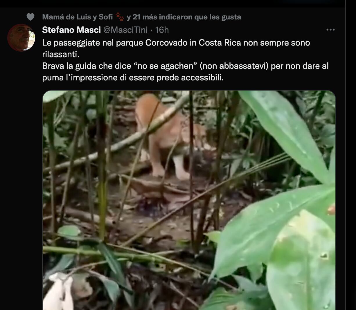 Según relató Stefano Masci en su cuenta de Twitter, “los paseos por el Parque Corcovado de Costa Rica no siempre son relajantes. El guía nos dijo “no se agachen” (no te encorves) para no dar al puma la impresión de ser una presa accesible”.