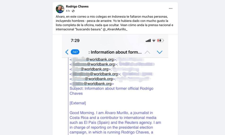 El contenido eliminado fue una publicación en la que el político publicó datos personales de un periodista costarricense y de funcionarias del Banco Mundial.