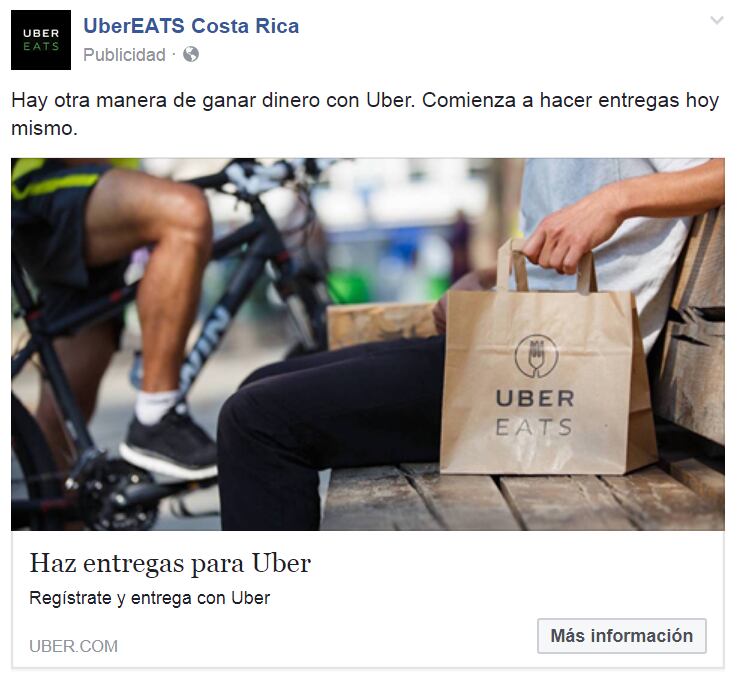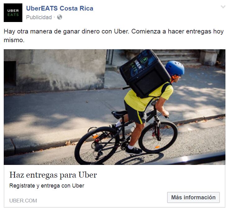 “Con UberEATS puedes elegir entre cientos de restaurantes. Al abrir la aplicación, puedes recorrer las noticias en busca de inspiración o buscar un restaurante o tipo de cocina concretos. Cuando encuentres algo que te apetezca, pulsa para añadirlo al carrito. Gane dinero llevándole a la gente lo que más le gusta. Lo que haga entre una entrega y otra es cosa suya. Así que ponga su música favorita y disfrute la ciudad.”, explica Uber en el recién nacido Facebook oficial que se encuentra como UberEATS Costa Rica.