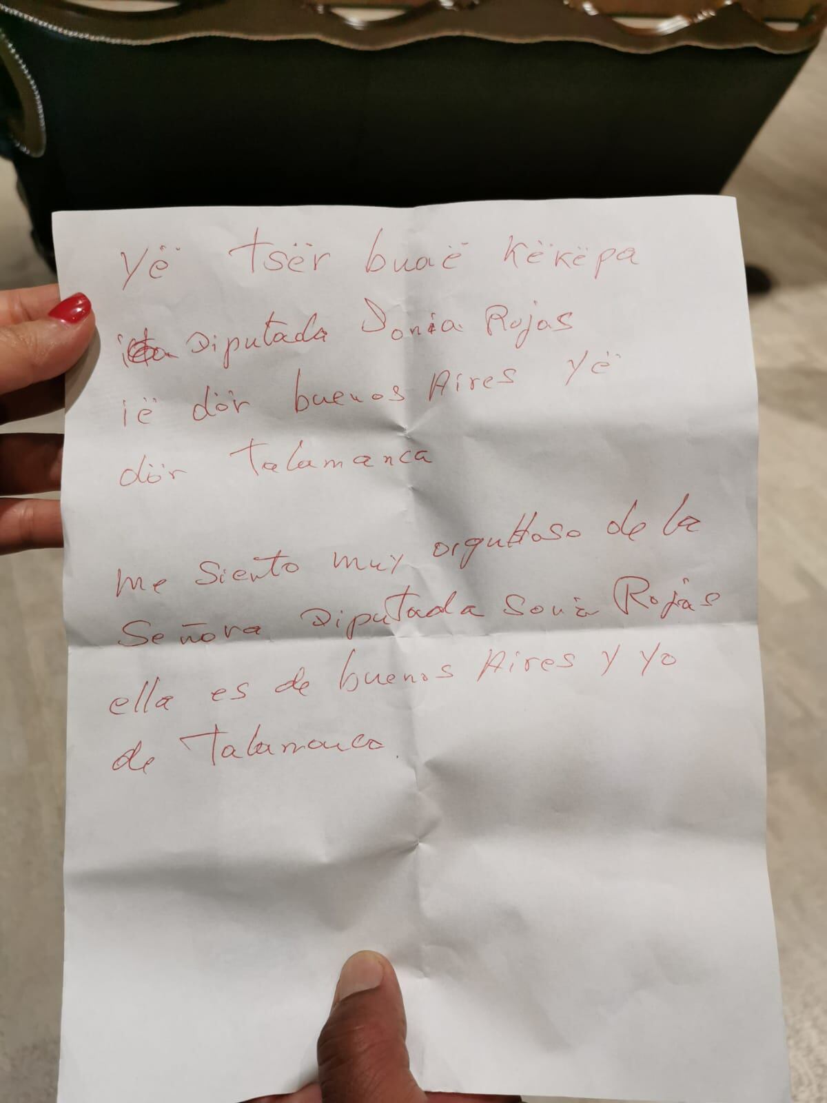 Esto dice el mensaje que le escribió: “Me siento muy orgulloso de la señora diputada Sonia Rojas, ella es de Buenos Aires y yo de Talamanca”.