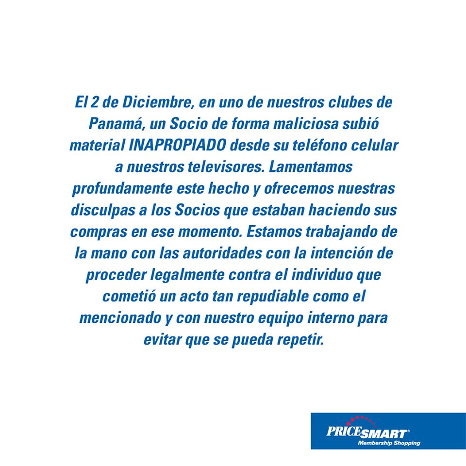 La firma multinacional PriceSmart confirmó la veracidad de varias imágenes que circulan en las redes sociales y en las que aparece una escena pornográfica en uno de los televisores de muestra en una de sus sucursales.