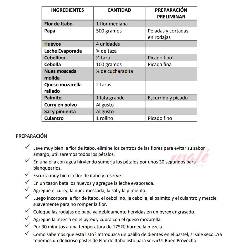 La chef ejecutiva Cinthya Malé Angulo, agregó que también tiene calcio, algo que respaldó otra chef profesional, Candy Zamora. Ambas, nos dieron una muy rica receta para hacer flor de Itabo y disfrutarla al máximo, no sin antes recordarnos que se puede hacer con huevo, con tomate, con carne molida y solita en un buen picadillo. Además se puede hacer ceviche.