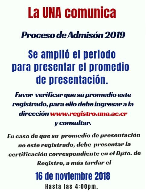 Los resultados de admisión para los de primer ingreso se publicarán el próximo martes 4 de diciembre en la página web del departamento de registro: www.registro.una.ac.cr