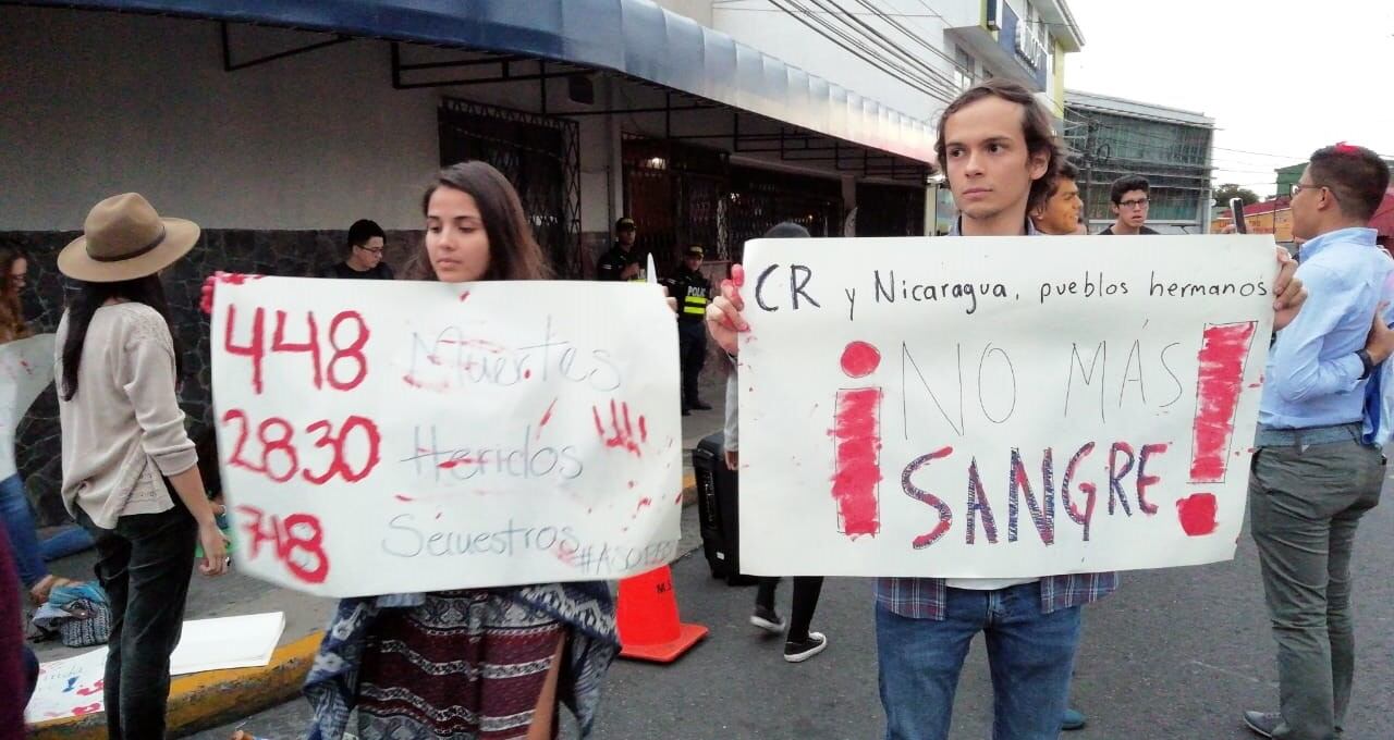 Un grupo de estudiantes de todas las universidades públicas del país se manifestaron este viernes frente a la embajada de Nicaragua, en barrio La California, para exigir la paz en el país vecino.