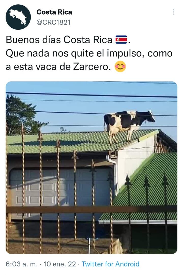 El inusual hecho ocurrió el domingo pasado a eso de las 4:40 p. m., en el centro de este cantón alajuelense, 400 metros al este del colegio de la comunidad. Las fotos y videos de la vaquita circularon de inmediato y los memes con la imagen de la cachudita en el techo pronto empezaron a circular.