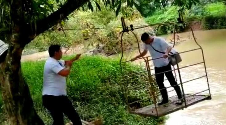 Los profesionales fueron a un pueblo que queda del otro lado del río La Muerte y no tuvieron más opción que subirse a una canasta para llegar a su destino y así inmunizar a la población.