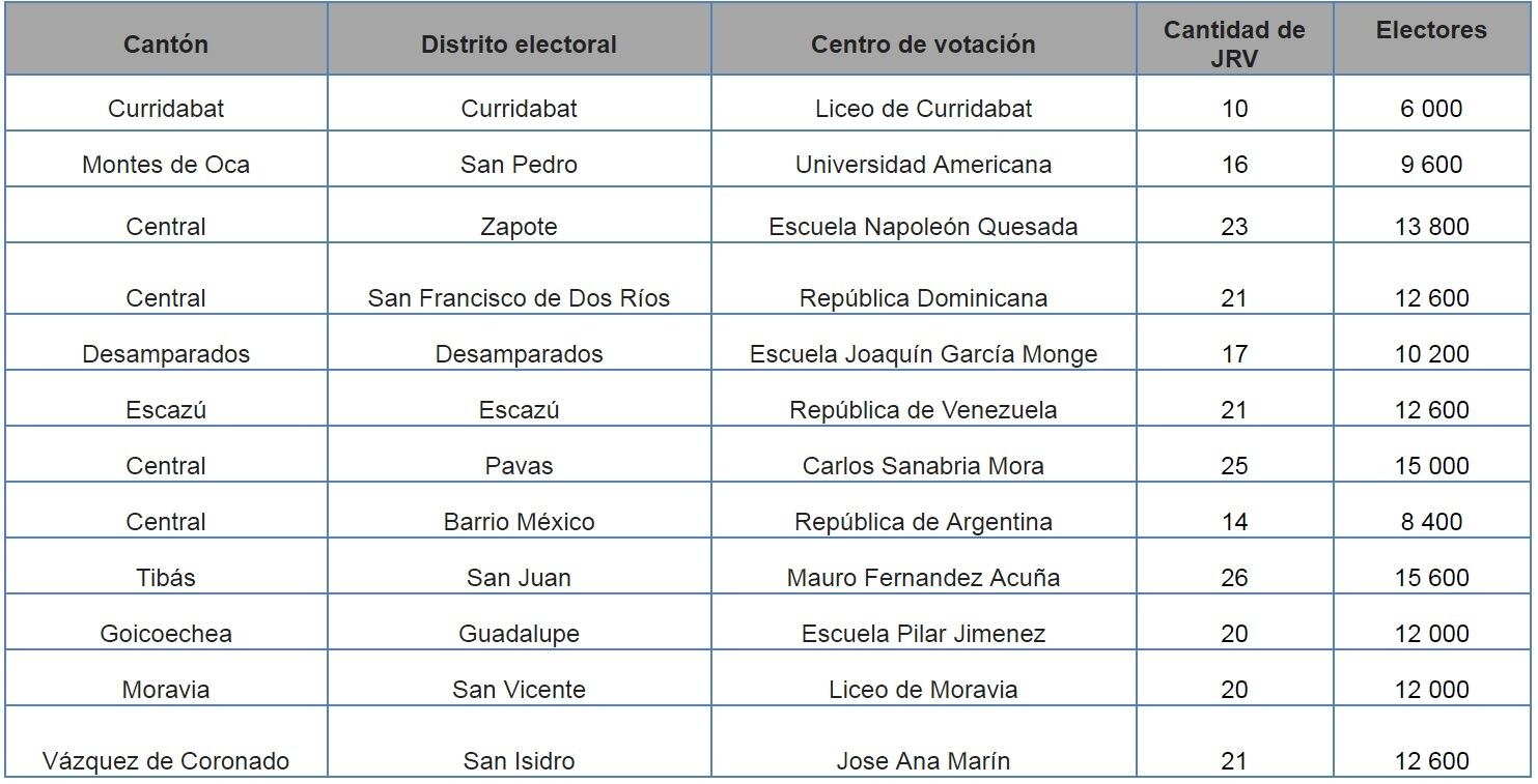 Estos sitios se eligieron como modelo tomando en cuenta la cantidad de juntas receptoras de votos, el nivel de participación en el proceso electoral 2016, la seguridad de los centros y la afluencia de ciclistas en el cantón.