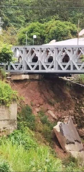 En apariencia, las fuertes lluvias que han azotado gran parte del país en los últimos días, y Cartago no ha sido la excepción, desprendieron una parte de los bastiones del puente (el único que permite el paso de vehículos pesados).