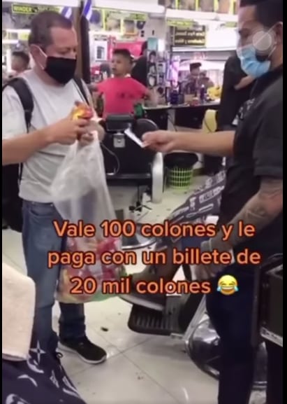 Dos de los barberos se pusieron de acuerdo para que uno fingiera que le iba a comprar una bolsita de papas --de las que cuestan ¢100-- con un billete de ¢20 mil, mientras el otro lo grababa con el celular, ya que sabían que el vendedor no iba a tener vuelto para ese billete.