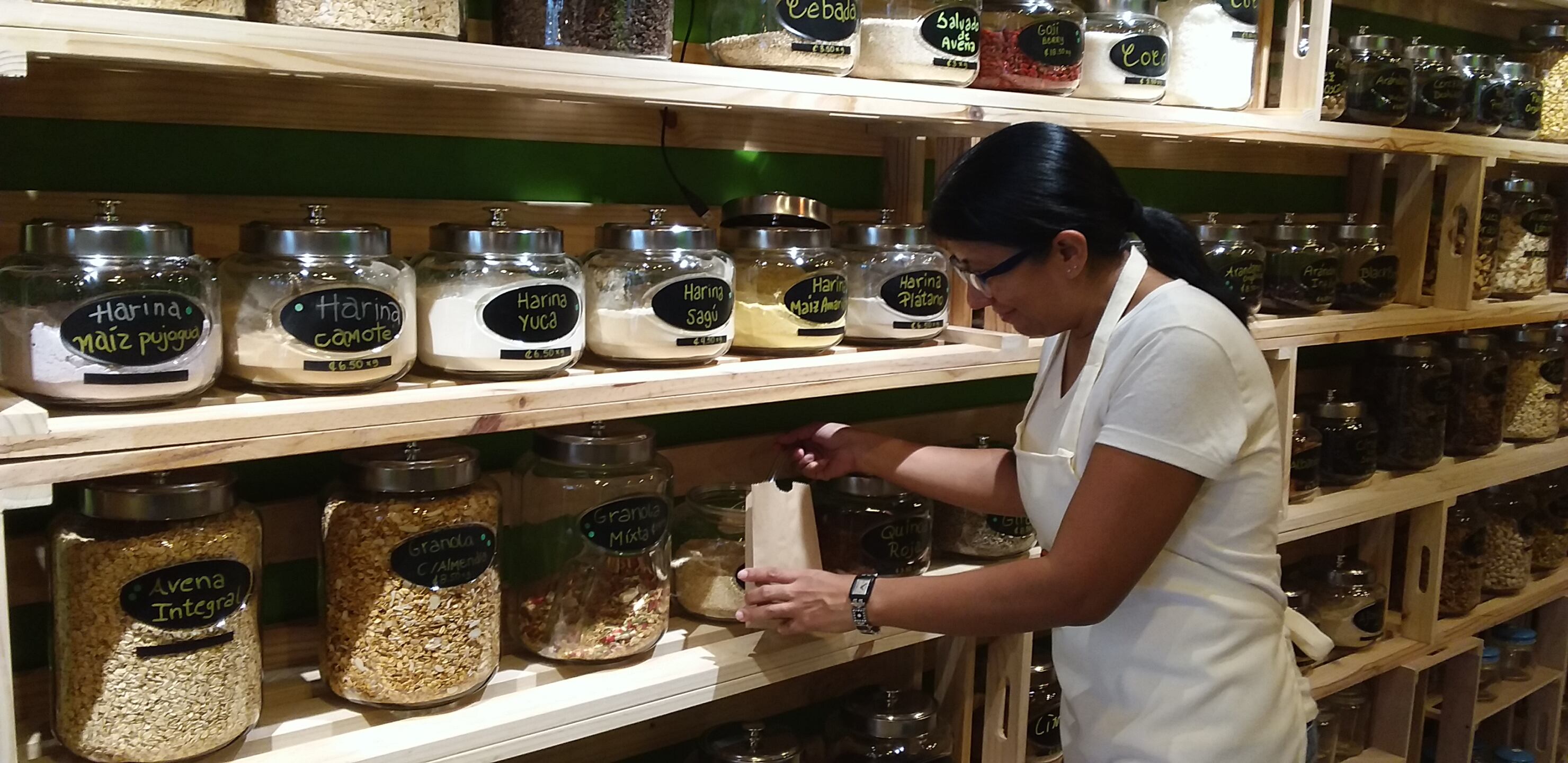 En este comercio, le ofrecen la posibilidad de comprar la cantidad que necesita de arroz, frijoles, avena, harina, lentejas, garbanzos, especias, pastas orgánicas y hasta productos frescos como lechuga, culantro o calégula, sin tener que llevar un paquetón que le dura un montón y se puede poner malo.