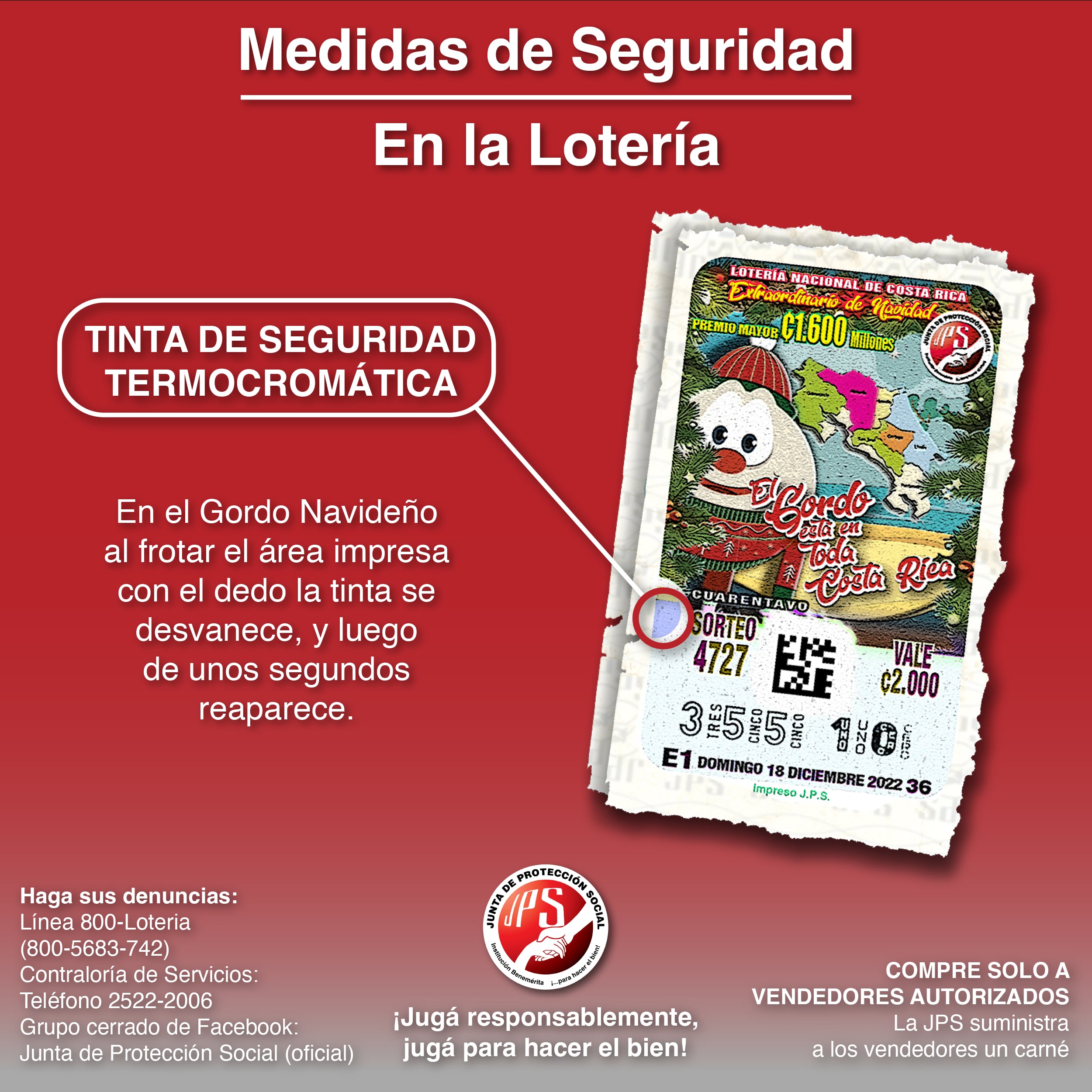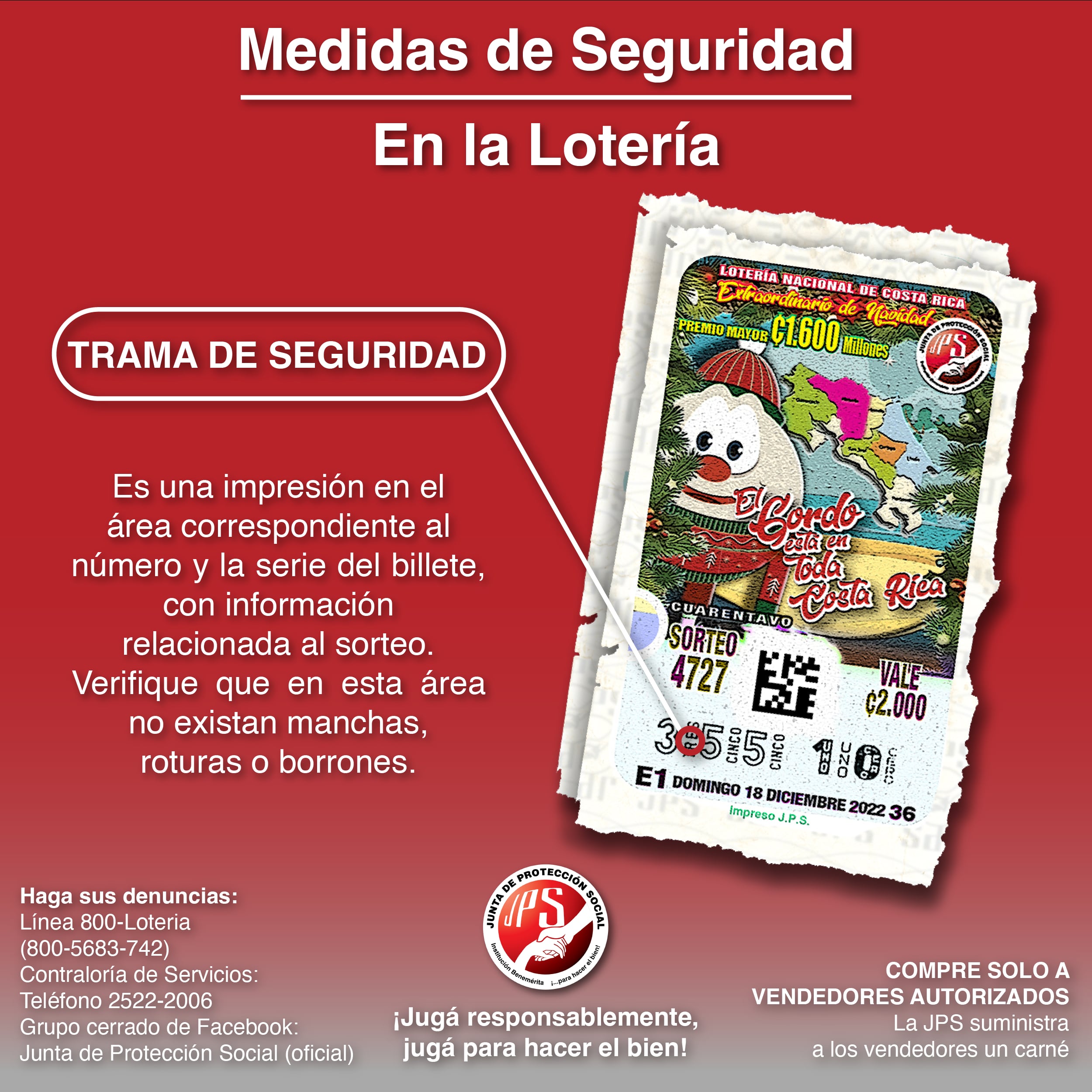 - Verifique el papel de seguridad, revise la marca de agua contraluz donde verá el logo de la Junta de Protección Social, las letras JPS y las frases “Lotería Nacional de Costa Rica” y “Junta de Protección Social”.