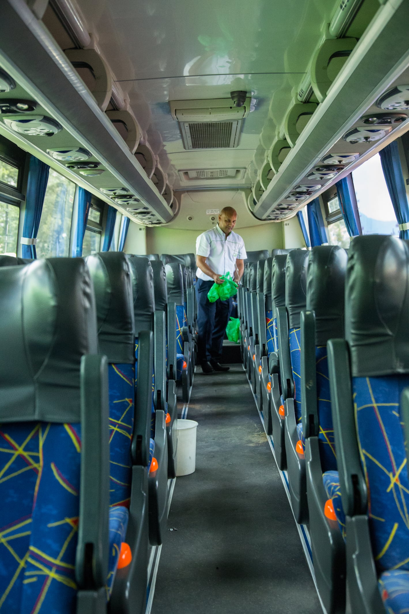 Todos los días, antes de iniciar el viaje hacia el Caribe o hacia la capital, desde la parte delantera del bus Tino les da a los ocupantes algunas recomendaciones para que todos tengan un buen viaje.
