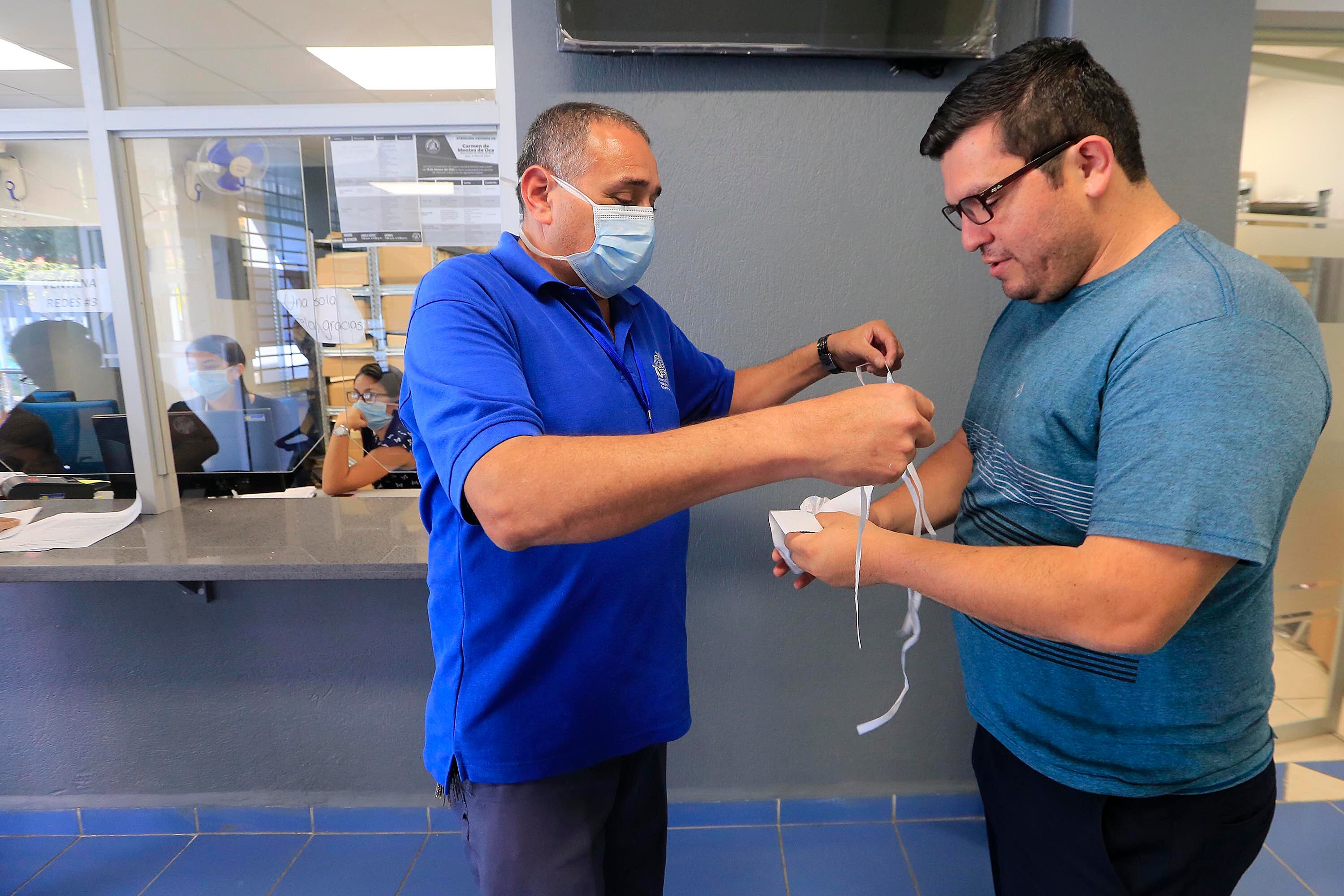 El oficial de seguridad le brinda de inmediato una mascarilla al paciente para contener sus gotas de saliva, ya que si efectivamente tiene el virus, podría contaminar superficies o a más personas.