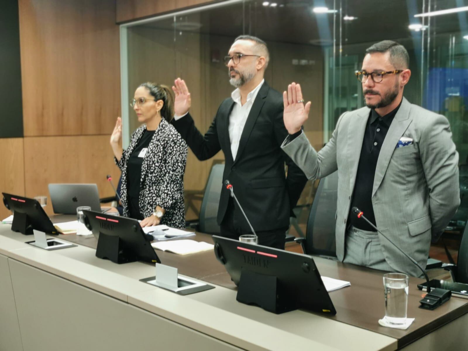 Los representantes de la empresa de comunicación y mercadeo Madison Revolution, Javier Mora Rivas, José Pablo Chaves Martínez y Adriana Barrantes Sibaja, colaboradora de la firma, comparecen la noche de este jueves ante la Comisión Investigadora de Financiamiento de los Partidos Políticos.