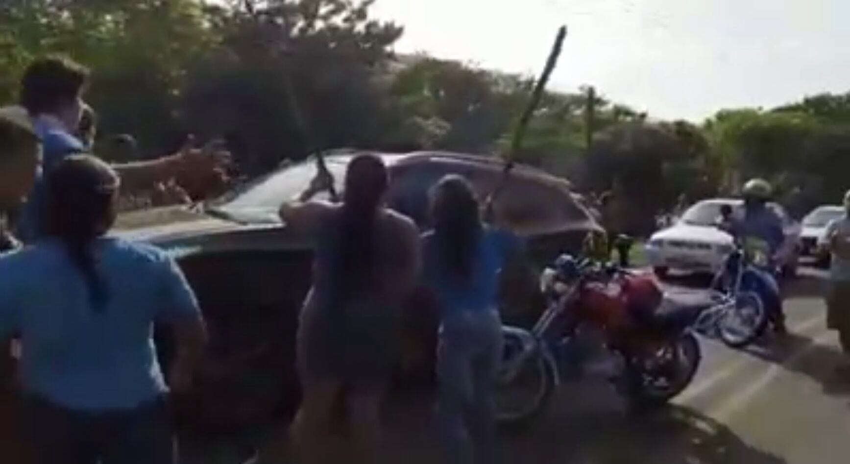 Un grupo de estudiantes de colegio le volaron palo a un carro cuando, en apariencia, su conductora intentaba pasar por el lugar donde se estaban manifestando.