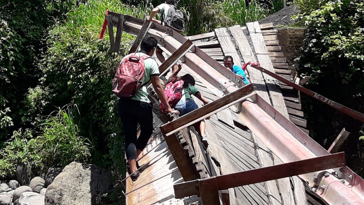El puente cedió el 18 de abril anterior por el peso de una vagoneta que estaba cruzando la vieja estructura de madera y desde entonces los vecinos, en especial los estudiantes del Liceo de Picagres, se la han estado jugando al pasar por ahí.