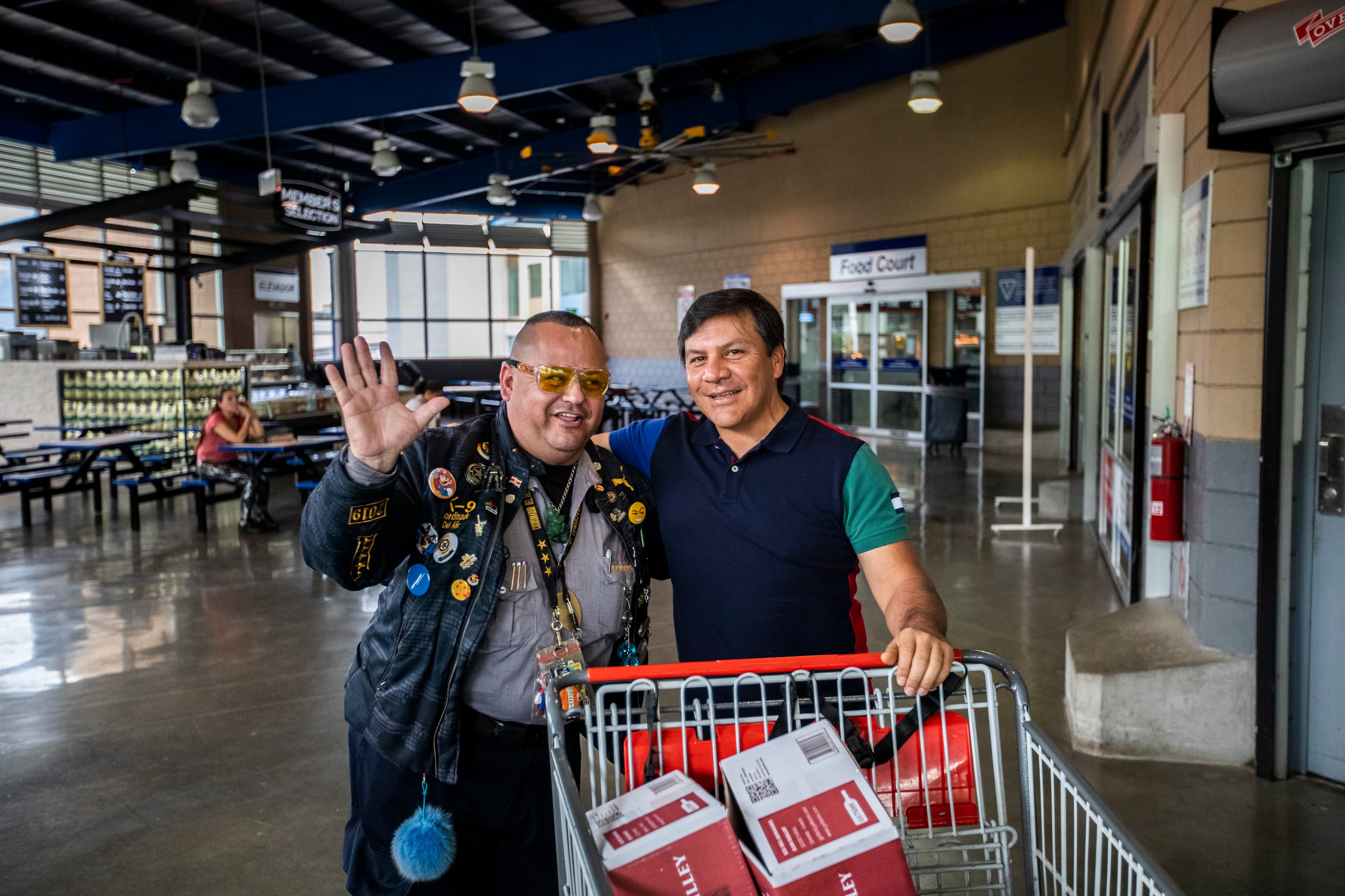 En su pecho porta orgulloso los reconocimientos a su excelente trabajo, pues además del gafete que lo identifica, anda con las tres tarjetas de cortesía que le dieron en Pricesmart y hasta un trofeo tiene en su casa por esa actitud de servicio.