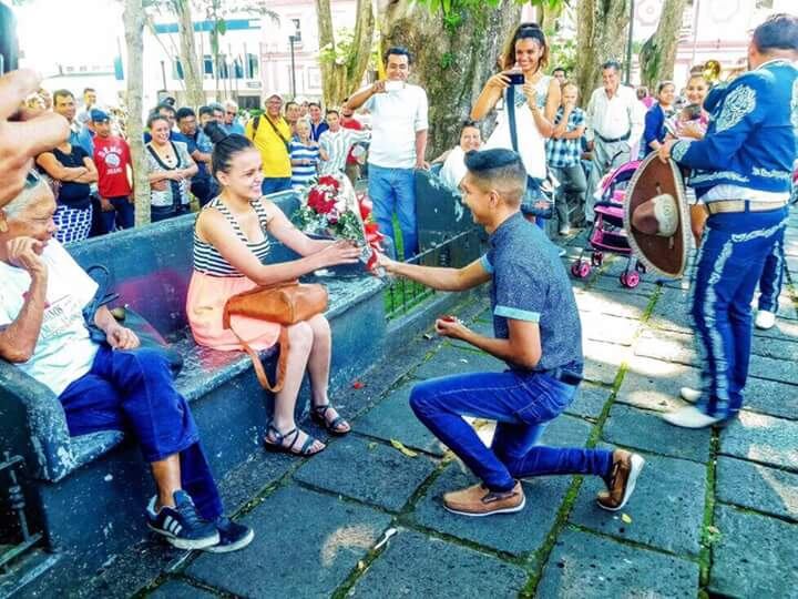 Además de escoger el concurrido parque, Henyel de 21 años llegó acompañado por el mariachi Guadalupano que se encargó de allanar el camino con la primera pieza.