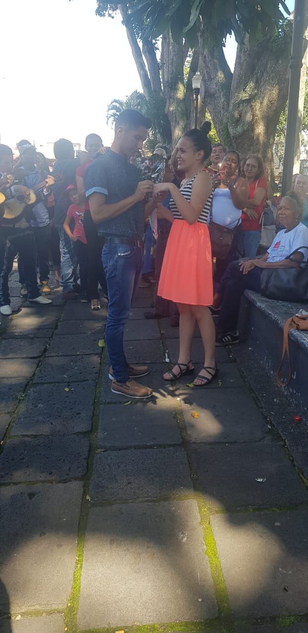 La rutina de la tarde en el parque central de Alajuela se vio interrumpida este domingo, a la 1:50 p.m., cuando Henyel Sandoval Ramírez, le propuso matrimonio a su novia Yulieth Delgado.