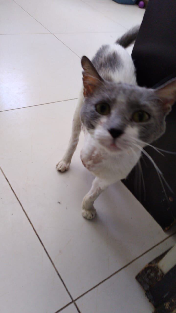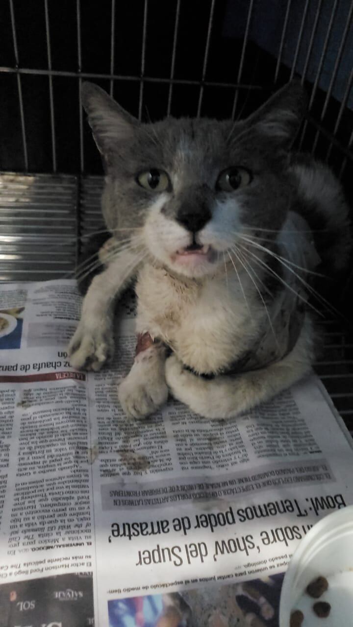 La rescatista cuenta que el gato ha tenido que estar encerrado en un galerón algunos días para que no se escape y no contagie a otros mininos y que ella no puede tenerlo porque cuenta con cinco perros que odian a los gatos.